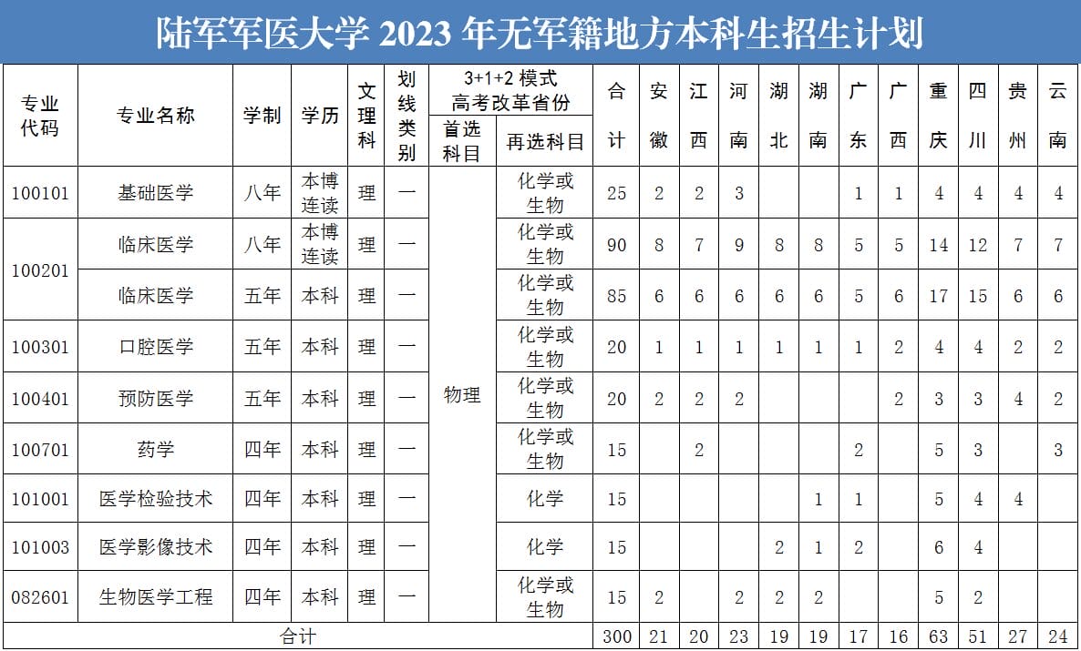 中国人民解放军陆军军医大学是一所具有悠久历史和光荣传统的全国重点大学、军队重点建设院校、全国首批博士学位授权单位、全国首批开办八年制医学教育高校,是“红色军医精神”(根脉可追溯至1931年建立的我军第一所军医学校——中国工农红军军医学校)的积极倡导者和传承者,也是“白求恩精神”的发源地。大学本部位于重庆,前身是建于1941年的太岳军区卫生部卫生教导队(第七军医大学前身)、1946年的松江军区军医学校和1937年的国立中正医学院(两者为第六军医大学前身),1954年第六军医大学(南昌)并入第七军医大学(重庆),1975年更名为第三军医大学。2017年以原第三军医大学为基础组建陆军军医大学,对外可称“第三军医大学”,是全军培训层次最多、培训体系最全的院校之一,在全国医学院校中始终位于第一方阵。
